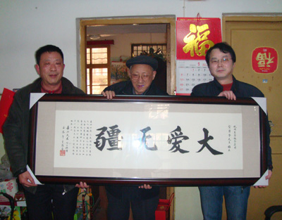 嘉興的民建會員付乃池老人70多歲了,以前患有嚴重的高血壓和哮喘病,家中經(jīng)濟困難,無法有效醫(yī)治,有了東華的資助金,他積極進行治療,身體得到很好康復。看到慰問組的人員,他流下了感激的淚水,還特地做了一幅“大愛無疆”的匾額送給宣董事長。旁題:君以仁愛之長期結(jié)對幫扶眾人,慷慨解囊,人均年萬余元。吾乃耄耋之年,貧病交加,喜得先生資助,月月如是,年復一年,恰似春風甘露,老朽得以頤養(yǎng)天年,不勝感激,僅聊表寸心。表達了他的感激之情。