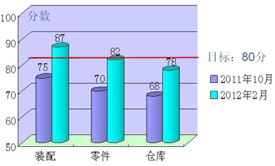 樣板先行,整體推進 事業(yè)部從實際出發(fā),確立“樣板先行、整體推進”方針,做到以點帶面、全面推進、激勵到位。在推行5S、TPS 活動的第一階段,我們確定了專機班為樣板,之后擴大到總成班、倉庫等,通過樣板區(qū)域的改善實例,教育引導事業(yè)部其它班組和區(qū)域的改善。樣板的建立一方面塑造了一個學習參照的對象,另一方面也激發(fā)了學、趕、超的氛圍,有效促進了整個事業(yè)部5S、TPS 改進活動熱情的提升。