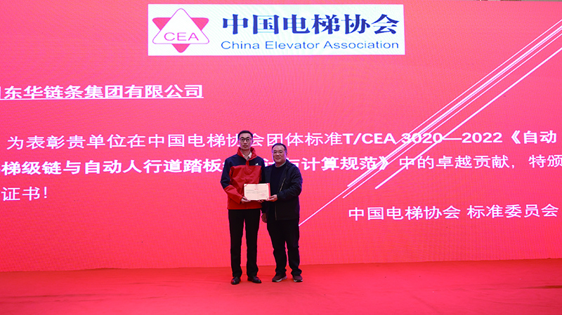近日,中國電梯協(xié)會標(biāo)準(zhǔn)委員會授予東華鏈條集團(tuán)榮譽(yù)證書,以表彰東華在中國電梯團(tuán)體標(biāo)準(zhǔn)T/CEA 3020-2022《自動扶梯梯級鏈與自動人行道踏板鏈設(shè)計(jì)與計(jì)算規(guī)范》中的卓越貢獻(xiàn)。東華扶梯工程鏈?zhǔn)聵I(yè)部代表公司出席了頒獎儀式。