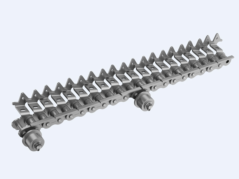 ● 印鐵烘房線鏈條是在標準短節距精密滾子鏈作為基鏈的基礎上加裝特殊附件的鏈條;典型產品結構為一側通過安裝內、外支撐片來保持鏈條直線度,另一側通過內外附板安裝花架運輸物品。